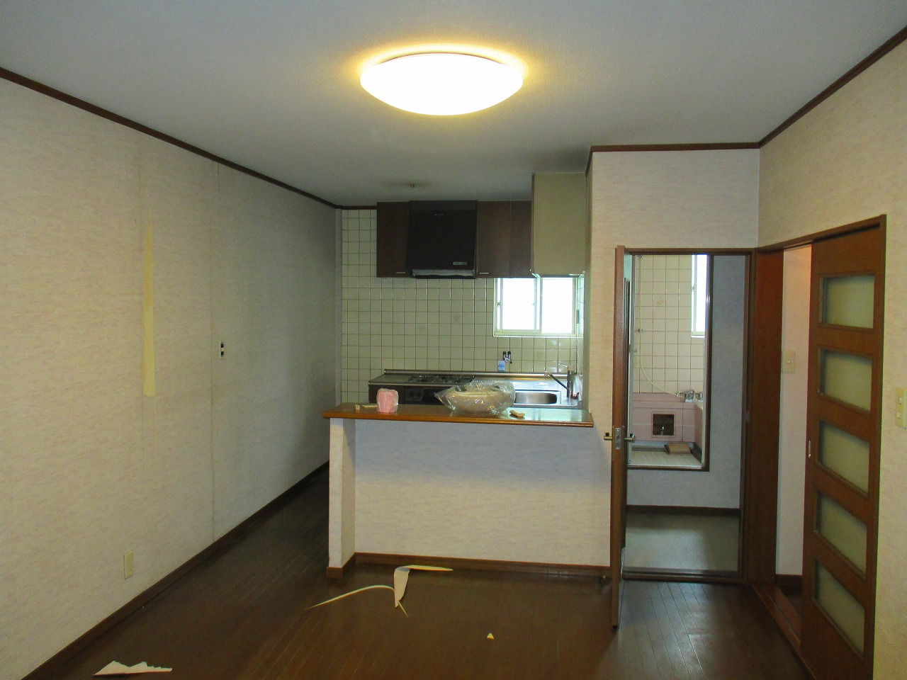 2Fのリビング キッチン バス トイレ 洗面 のフルリフォームをしました。 建具も全て枠から取り替えてスッキリしました。 工期は約3週間ほどで完成致しました。